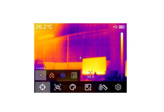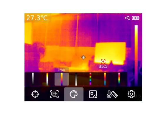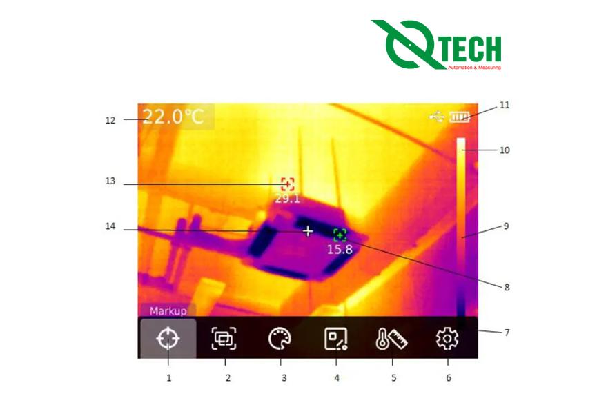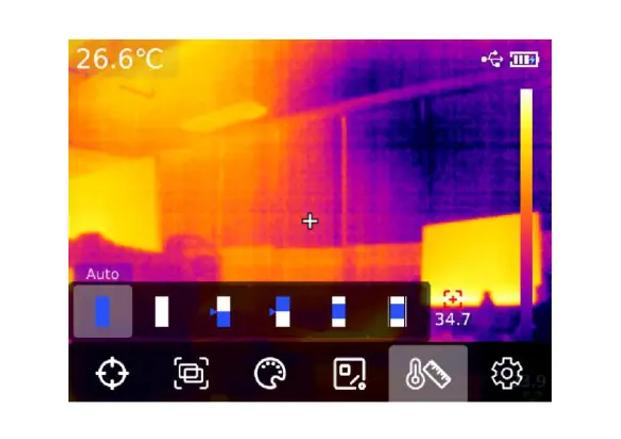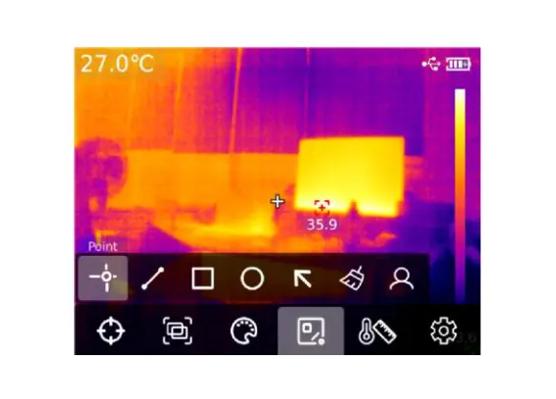 Nhấn phím “SET” để bật lên các tùy chọn menu chính và chọn “Công cụ đo nhiệt độ” bằng cách sử dụng “Phím trái / phải”. Bằng cách sử dụng “Phím trái / phải”, chọn loại đối tượng phân tích (bao gồm đo nhiệt độ điểm, đo nhiệt độ đường thẳng, hình chữ nhật và hình tròn) và chọn mục tiêu (chỉ có thể sử dụng chức năng này khi đối tượng phân tích được thêm vào trang chủ trang). Xóa tất cả và các công cụ đặt trước.