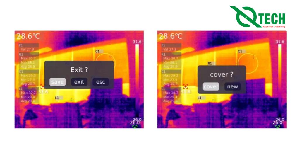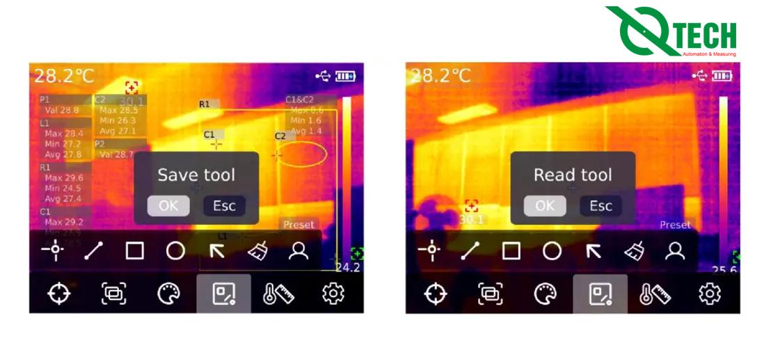 Sau khi nhấn phím “SET” để xóa tất cả các chức năng, tất cả các đối tượng phân tích đo nhiệt độ trên trang hiện tại sẽ bị xóa. Nếu có đối tượng phân tích đo nhiệt độ trên trang chủ, hãy nhấn phím “SET” để chọn công cụ đặt trước và hộp nhắc “Công cụ lưu” sẽ bật lên. Nếu bạn chọn OK, đối tượng phân tích hiện tại sẽ được lưu và công cụ đặt trước có thể được sử dụng vào lần sau. Nếu không có đối tượng phân tích nhiệt độ trên trang chủ, hãy nhấn phím "SET" để chọn công cụ đặt trước và hộp thoại Công cụ Đọc sẽ được hiển thị. Nếu bạn chọn OK, công cụ đặt trước được lưu lần trước sẽ được thêm vào trang chủ.