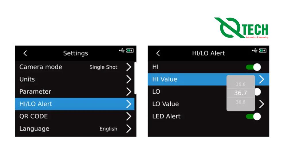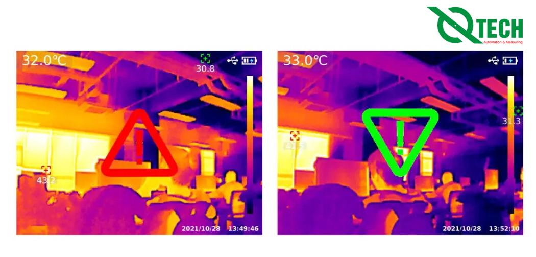 Khi nhiệt độ của đối tượng đo vượt quá giá trị nhiệt độ báo động nhiệt độ cao, tam giác dương màu đỏ sẽ bật lên. Khi nhiệt độ của đối tượng được đo thấp hơn giá trị nhiệt độ cảnh báo nhiệt độ thấp, hình tam giác ngược màu xanh lá cây sẽ bật lên.