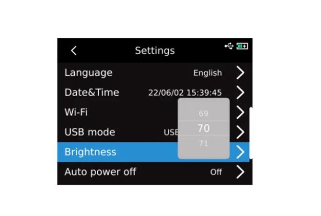 Sau khi vào menu cấp đầu tiên trên trang Cài đặt, hãy chọn tùy chọn “Độ sáng” và chọn cường độ sáng (1-100) bằng cách sử dụng “Phím Lên / Xuống”.