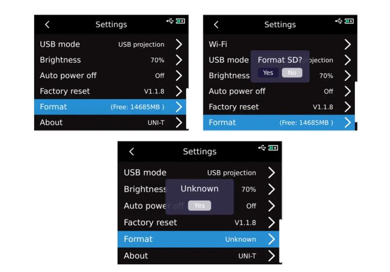 Sau khi vào menu cấp đầu tiên trên trang Cài đặt, hãy chọn tùy chọn “Định dạng” và nhấn “phím SET”. Nếu có thẻ SD, thông báo “định dạng thẻ SD” sẽ bật lên? Nếu bạn chọn Có, sẽ định dạng thẻ SD. Nếu không có thẻ SD, thông báo “Không xác định” sẽ được hiển thị.