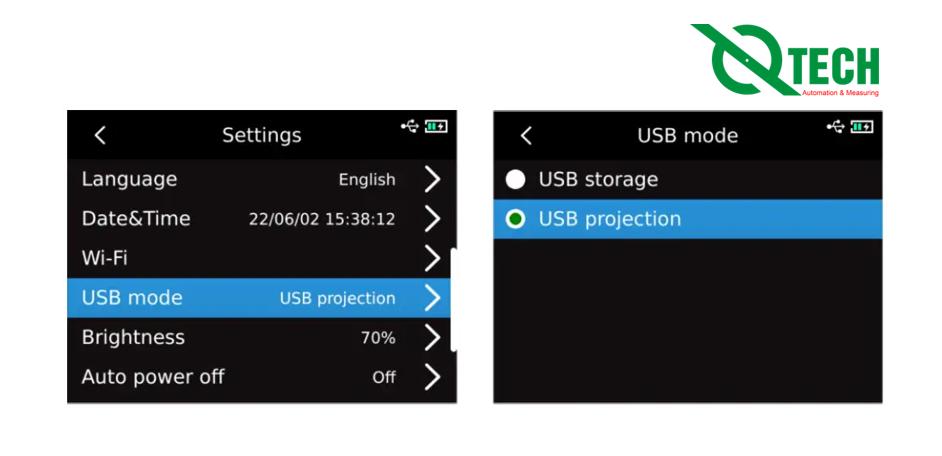 Sau khi vào menu cấp đầu tiên trên trang Cài đặt, chọn tùy chọn “Chế độ USB” và nhấn “phím SET” để vào menu Phụ của “Chế độ USB”. Chọn “Bộ lưu trữ USB / Chiếu qua USB” bằng cách sử dụng “Phím Lên / Xuống” và nhấn phím “SET” để chọn.