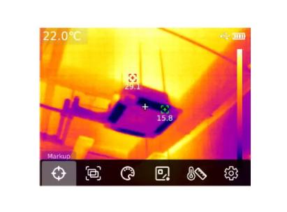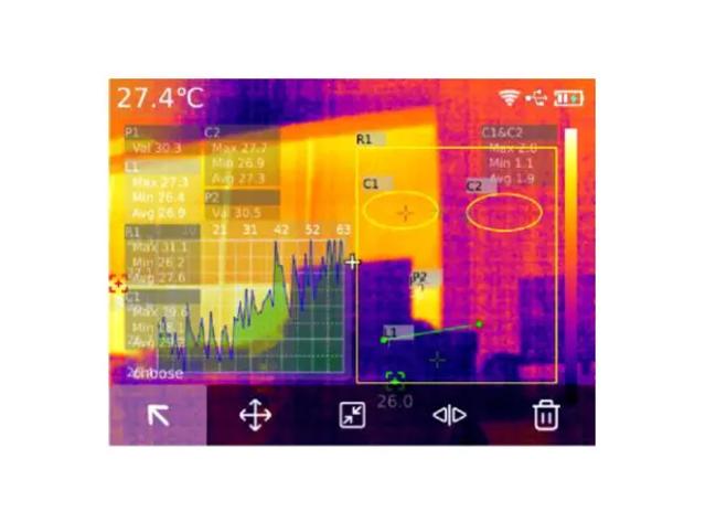 Nhấn phím "SET" để thêm đối tượng phân tích đo nhiệt độ điểm, đường thẳng, hình chữ nhật và hình tròn và thanh menu phụ của "Chọn mục tiêu" sẽ tự động bật lên. Chọn các chức năng cần thiết bằng cách sử dụng “Phím trái / phải”, bao gồm các chức năng sau: chọn, di chuyển, kéo giãn (đối với đối tượng phân tích đo nhiệt độ điểm, không thể kéo giãn), so sánh (đối với đối tượng phân tích đo nhiệt độ điểm, nó chỉ có thể được so sánh với đối tượng phân tích đo nhiệt độ điểm và thông tin so sánh tương ứng sẽ được hiển thị ở bên phải sau khi so sánh), và xóa (chỉ có thể xóa đối tượng phân tích đo nhiệt độ được chọn hiện tại). Sau khi thêm đối tượng phân tích đo nhiệt độ, thông tin nhiệt độ tương ứng sẽ được hiển thị ở phía bên trái. Khi chọn đối tượng phân tích đo nhiệt độ đường, đường cong nhiệt độ của vùng đường sẽ hiển thị ở góc dưới bên trái.
