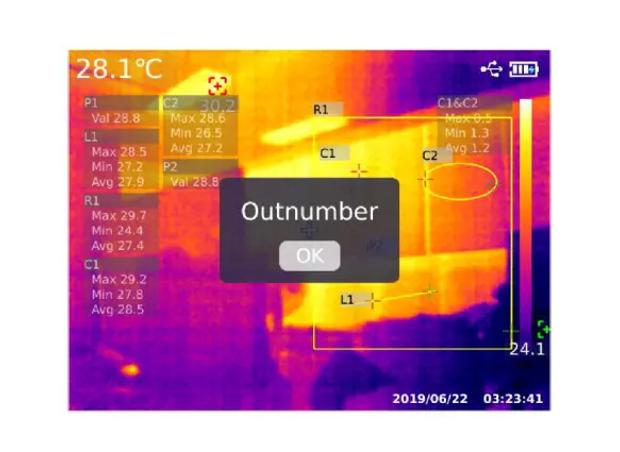 Note: Có thể thêm tối đa các đối tượng phân tích đo nhiệt độ năm điểm. Đối với các đối tượng phân tích nhiệt độ dòng, nó chỉ có thể được thêm một. Có thể thêm tối đa ba đối tượng phân tích nhiệt độ hình chữ nhật và hình tròn. Tổng số đối tượng phân tích đo nhiệt độ không được vượt quá sáu. Nếu số lượng đối tượng phân tích vượt quá ngưỡng, sẽ không thêm bất kỳ đối tượng phân tích nào và sẽ hiển thị thông báo “Outnumber”.