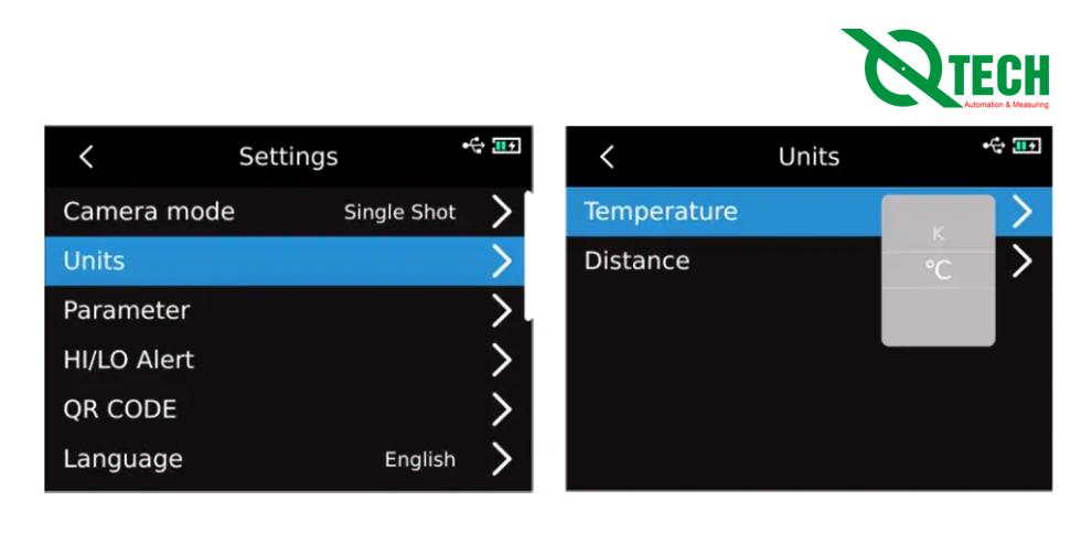 Sau khi vào menu cấp đầu tiên trên trang Cài đặt, chọn tùy chọn “Đơn vị” và nhấn phím “ĐẶT” để vào menu phụ của “Đơn vị”. Sử dụng “Phím Lên / Xuống” để chọn nhiệt độ / khoảng cách. Khi chọn nhiệt độ, nhấn “Phím Lên / Xuống” để chọn đơn vị nhiệt độ (℃ / K / ℉). Đơn vị khoảng cách, không thể thay đổi.