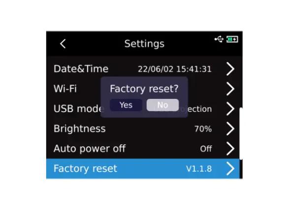 Sau khi vào menu cấp đầu tiên trên trang Cài đặt, hãy chọn tùy chọn “Khôi phục cài đặt gốc”, nhấn “phím SET” và lời nhắc “Tắt máy và khôi phục cài đặt gốc” sẽ bật lên. Nếu bạn chọn Có, thiết bị sẽ tự động tắt và thiết bị sẽ khôi phục cài đặt gốc sau khi khởi động thủ công.