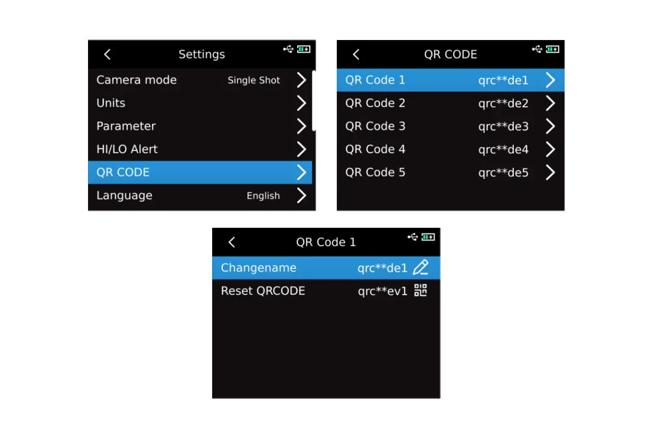 Sau khi vào menu cấp đầu tiên trên trang Cài đặt, hãy chọn tùy chọn “MÃ QR” và nhấn phím “ĐẶT” để vào menu phụ MÃ QR. Chọn các Mã QR khác nhau bằng cách sử dụng “Phím Lên / Xuống” và nhấn “Phím ĐẶT” để vào trang thay đổi cho tên / MÃ QR CODE.