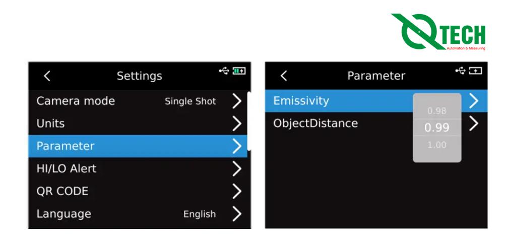 Sau khi vào menu cấp đầu tiên của trang Cài đặt, chọn tùy chọn “Tham số” và nhấn phím “ĐẶT” để vào menu phụ của “Tham số”. Chọn độ phát xạ / khoảng cách đối tượng thông qua “Phím Lên / Xuống” và nhấn “Phím SET” để chọn các thông số cần thay đổi. Nhấn “Phím Lên / Xuống” để chọn giá trị cho thông số. Khi cài đặt tham số khoảng cách đối tượng, nhấn phím “SET” để vào menu phụ “Khoảng cách đối tượng”, sau đó sử dụng “phím SET” và “Phím Lên / Xuống” để sửa đổi các thông số.