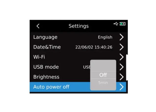 Sau khi vào menu cấp đầu tiên trên trang Cài đặt, hãy chọn tùy chọn “Tắt máy tự động” và chọn Tắt / 5/10/20/30/45/60/90 bằng cách sử dụng “Phím Lên / Xuống”.